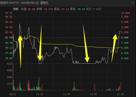 你以为巨震之后它的行情就到头了吗?太天真了。8月21日,新城市股价在之前5连阳之后,盘中快速冲高,涨幅近6%,再创上市1年零3个月以来的历史新高67.13元/股,之后两度盘中被砸跌停。就在股民们绝望的时候,尾盘它又拉了回来,最后还收涨逾2%。