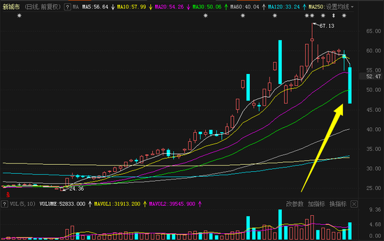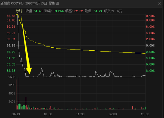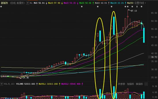 例如,8月3日~4日,新城市连拉两个涨停创出上市以来历史新高,而在8月5日却高开约4%后瞬间跌停收出光头光脚长阴线,成交量也巨幅放大至之前近1年新高。