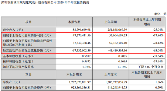 公司8月26日公布的半年报显示,2020年上半年营收、归母净利、归母扣非净利、经营活动现金流均同比出现了两位数的下滑,分别达到-25.04%、-17.94%、-28.42%、-63.04%,同日公司还公告2020年上半年计提信用减值损失金额为12,893,339.47元。