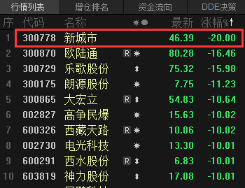 《每日经济新闻》记者注意到,在今日两市跌幅居前的10只个股之中,前5名均被创业板个股占据,新城市是唯一一只跌停,也是唯一跌幅达到20%的个股。