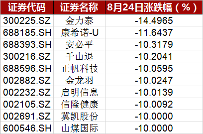 记者根据Wind数据统计显示,8月24日创业板注册制正式实施当天,有两只创业板个股收盘跌幅超过10%。其中之一是在退市整理期内的千山退(维权),跌幅10.2%,而金力泰跌幅达到14.5%,跌幅排名第一。