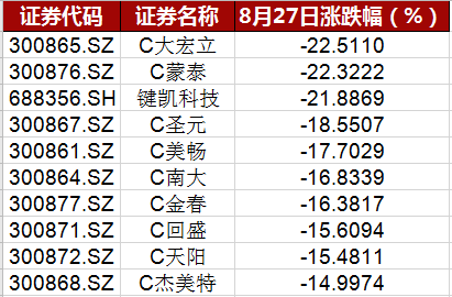 8月25日,创业板个股普遍表现较强,两市跌幅排名第一的仍然是天山退。8月26日、27日、28日、31日,两市跌幅居前的个股中出现多只刚刚上市交易不到5个交易日、无涨跌幅限制的次新股,并且多只跌幅曾超过20%。例如8月26日的C卡倍亿;8月27日的C大宏立和C蒙泰等,以及8月28日的C蒙泰和C卡倍亿等。8月31日跌幅超过10%的个股也有千山退,此外还有科创板次新股瑞晟智能,跌幅19.18%。