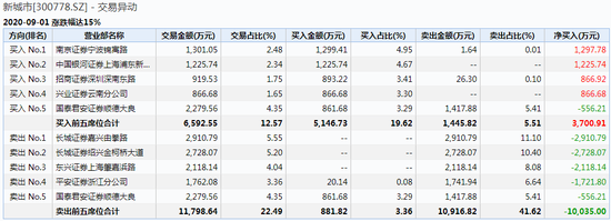盘后Wind数据显示,新城市今日因涨跌幅达15%登上龙虎榜,前买五前卖五席位累计净卖出6334万元。