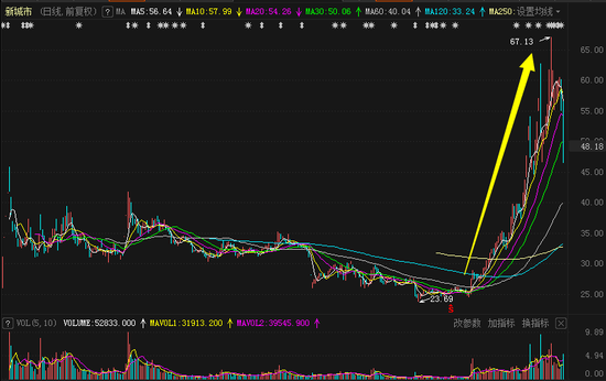 新城市真正展现出自己的“实力”是在6月16日。当日跳空上行收于涨停,之后开始了一波凶悍的上涨。仅仅2个月后的8月21日,新城市盘中最高涨至67.13元/股,较6月15日的盘中低点24.36元/股,期间最高涨幅高达176%,冲天的“牛气”十分惊人。
