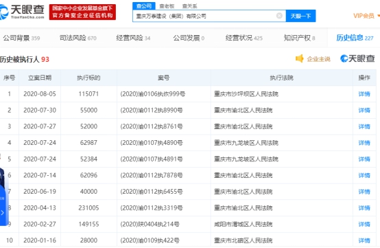 天眼查显示,2014年2月-2020年8月,万泰建设93次成为被执行人。