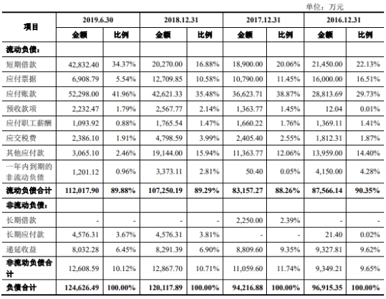 2016年-2018年及2019年1-6月,四方新材负债合计分别为9.69亿元、9.42亿元、12.01亿元、12.46亿元,其中流动负债分别为8.76亿元、8.32亿元、10.73亿元和11.20亿元。