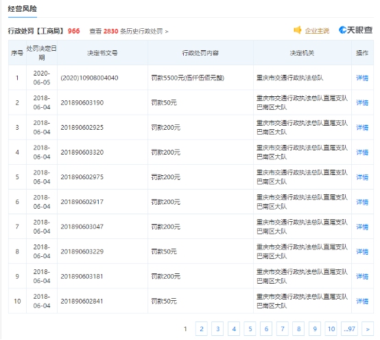 根据天眼查记录的信息,四方新材驾驶员及其驾驶的车辆在2017年3月10日至2017年12月8日期间,受到重庆交通行政执法方面的处罚多达到522次,绝大部分为交通违法行为。另外,国家企业信用信息公示系统显示,四方新材共有627起交通违法行为,作出行政处罚的决定日期都是2017年。