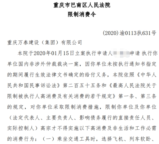 此外,今年5月14日,重庆市巴南区人民法院对万泰建设下发限制消费令,指出,因万泰建设未按执行通知书指定的期间履行生效法律文书确定的给付义务,对万泰建设采取限制消费措施,限制万泰建设及万泰建设(法定代表人、主要负责人、影响债务履行的直接责任人员、实际控制人)高宗才不得实施高消费及非生活和工作必需的消费行为。