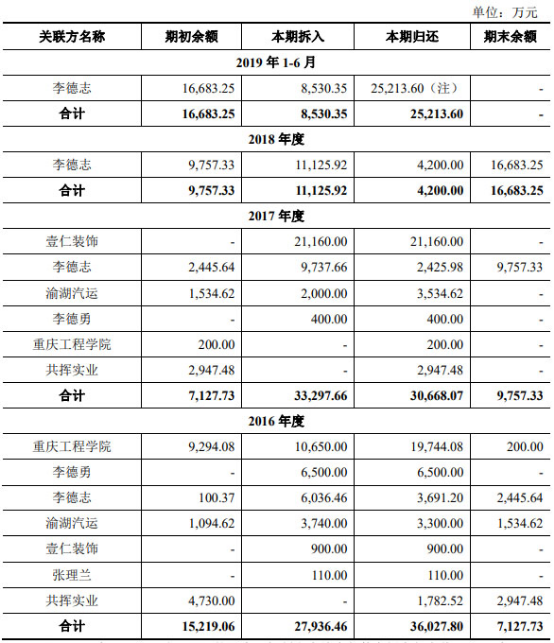 2016年,四方新材向实控人李德志、张理兰等6方拆入资金期初余额为1.52亿元、本期拆入2.79亿元、本期归还3.60亿元,期末余额为0.73亿元。2017年,四方新材向6关联方拆入资金3.33亿元,归还3.07亿元,期末余额为0.98亿元。2018年,四方新材向李德志拆入1.12亿元,归还0.42亿元,期末余额1.67亿元。2019年1-6月,四方新材向李德志拆入0.85亿元,归还2.52亿元,期末余额为0。