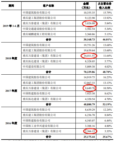 2016年-2018年及2019年1-6月,重庆万泰建设(集团)有限公司(以下简称“万泰建设”)分别为四方新材第5、3、3、3大客户。各期四方新材对万泰建设销售金额分别为2366.15万元、9649.78万元、1.68亿元、3826.08万元,占主营业务收入比例分别为3.35%、10.50%、11.64%、5.84%。