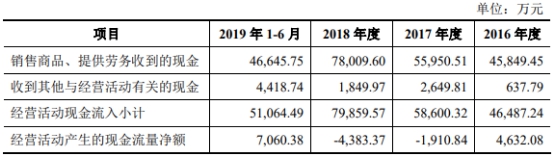 2016年-2018年及2019年1-6月,四方新材营业收入分别为7.07亿元、9.28亿元、14.52亿元、6.70亿元,销售商品、提供劳务收到的现金分别为4.58亿元、5.60亿元、7.80亿元、4.66亿元,后者与前者分别相差-2.49亿元、-3.69亿元、-6.72亿元、-2.04亿元。