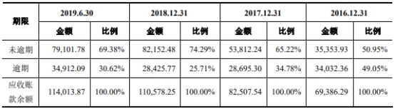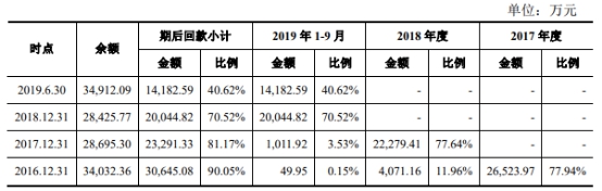 截至2019年9月末,报告期各期末逾期应收账款的收回比例分别为90.05%、81.17%、70.52%和40.62%。据此计算,截至2019年9月末,各期逾期应收账款未收回金额达0.34亿元、0.54亿元、0.84亿元、2.07亿元。