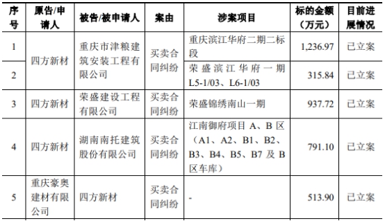 5件尚在诉讼过程中的诉讼分别为:四方新材诉重庆市津粮建筑安装工程有限公司的2起买卖合同纠纷,标的金额合计1552.81万元;四方新材诉荣盛建设工程有限公司的买卖合同纠纷,标的金额937.72万元;四方新材诉湖南南托建筑股份有限公司的买卖合同纠纷,标的金额791.10万元;重庆豪奥建材有限公司诉四方新材的买卖合同纠纷,标的金额513.90万元。