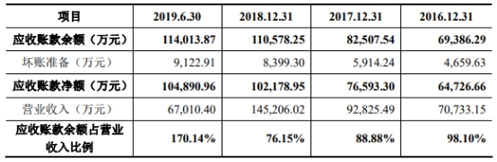 2016年-2018年及2019年1-6月,四方新材应收账款余额分别为6.94亿元、8.25亿元、11.06亿元、11.40亿元;应收账款余额占营收的比例分别为98.10%、88.88%、76.15%、170.14%。