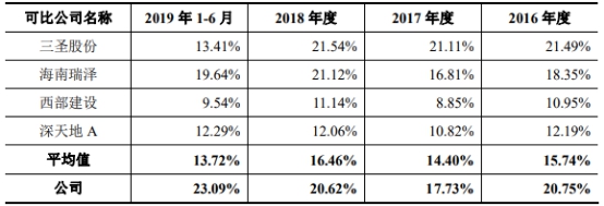 各期,四方新材产品毛利率均超同行均值,且去年上半年为同行最高。2016年-2018年及2019年1-6月,四方新材商品混凝土销售毛利率分别为20.75%、17.73%、20.62%、23.09%,同行业可比上市公司平均值分别为15.74%、14.40%、16.46%、13.72%。
