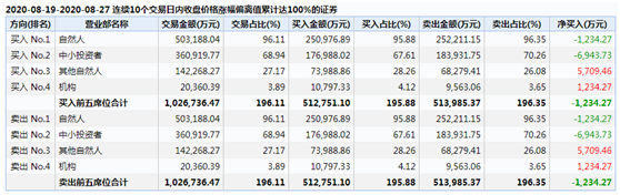 统计数据显示,8月19日至27日期间,公司股票累计成交金额26.18亿元。其中,自然人累计买入金额25.10亿元,交易占比95.88%;机构累计买入1.08亿元,交易占比4.12%。