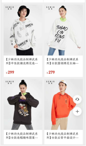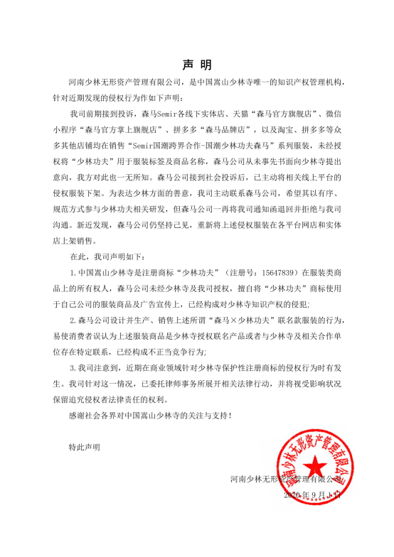河南少林无形资产管理有限公司向证券时报·e公司记者发来的一则声明显示,作为中国嵩山少林寺唯一的知识产权管理机构,该公司前期接到投诉,森马Semir各线下实体店、天猫“森马官方旗舰店”、微信小程序“森马官方掌上旗舰店”、拼多多“森马品牌店”,以及淘宝、拼多多等众多其他店铺均在销售“Semir国潮跨界合作-国潮少林功夫森马”系列服装,未经授权将“少林功夫”用于服装标签及商品名称。