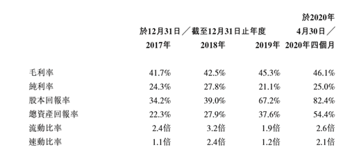 根据招股书,2017财年、2018财年、2019财年及2020年四个月,现代中药集团的收益分别约为1.06亿元(人民币,下同)、1.74亿元、2.19亿元及1.04亿元;毛利率分别为41.7%、42.5%、45.3%及46.1%;纯利率分别为24.3%、27.8%、21.1%及25%。