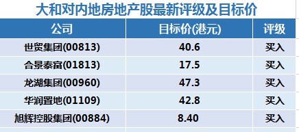 大和:部分内地房地产相关股的最新评级及目标价(表)