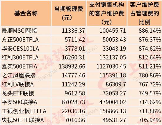 天相投顾数据显示,有156只基金支付给销售机构的客户维护费超过管理费,其中多数是指数基金。具体来看,景顺MSCI联接基金尾佣比例为886.14%,方正500ETF尾佣比例为876.37%,嘉实红利300ETF尾佣比例也超过800%。