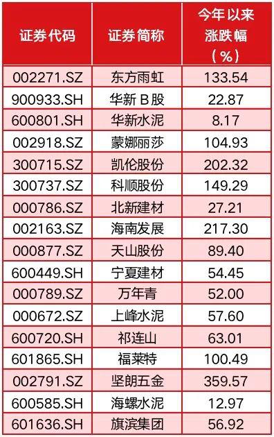 与采掘形成对照,还有几类周期股,自今年7、8月份以来,不断有公司创新高,比如建筑材料板块合计17家公司创历史新高,占比24.29%,而这些公司全部都是今年7月份以来涨至历史最高价的。如华新水泥、北新建材、天山股份、上峰水泥(维权)、祁连山、海螺水泥等水泥涨价相关。