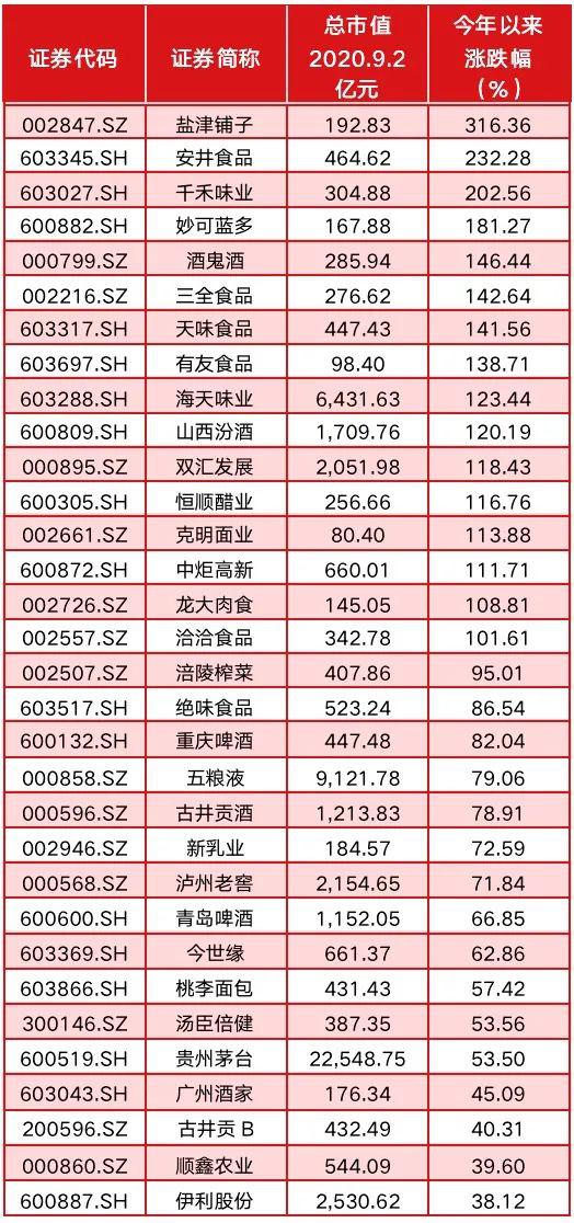 一些大众耳熟能详的食品饮料公司,如安井食品、桃李面包、洽洽食品、海天味业、重庆啤酒、绝味食品、盐津铺子等均创历史新高。其中,8月份以来,创新高的公司就高达32家。其中,盐津铺子年内股价涨超3倍,安井食品、千禾味业涨超2倍,妙可蓝多、酒鬼酒、三全食品、天味食品、有友食品等多只个股股价翻倍。