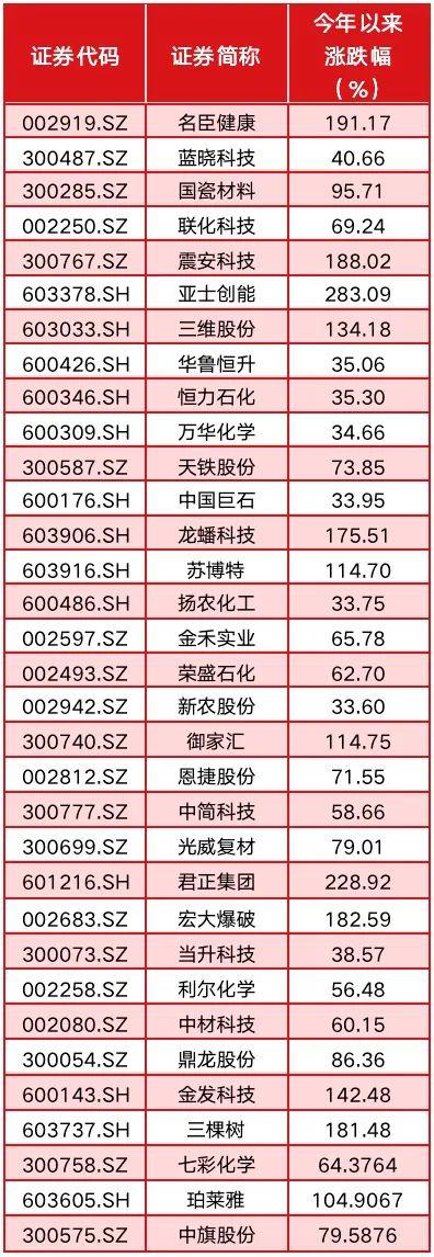 此外,化工行业年内有55家公司创历史新高,行业占比16.62,其中,8月以来,就有33家创新高,行业占比9.97%。名臣健康、震安科技、龙蟠科技、苏博特、御家汇、君正集团、金发科技等股价均实现翻倍增长。此外,恒力石化、荣盛石化、扬农化工等受益于涨价的品种也有不错的市场表现。