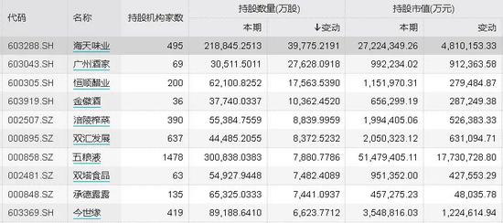 同时,从机构持有数量看,中报机构持股数量正向变动上,海天味业、广州酒家、恒顺醋业、金徽酒、涪陵榨菜、双汇发展、五粮液、双塔食品等排名前10位,其中海天味业以179070.03万股的数量居首。