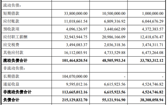 2017年-2019年,惠泰医疗负债总额分别为0.38亿元、0.55亿元、2.15亿元,其中流动负债分别为0.34亿元、0.49亿元、1.01亿元,非流动负债分别为0.05亿元、0.07亿元、1.14亿元。