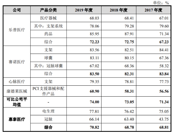 2017年-2019年,惠泰医疗综合毛利率分别为68.81%、68.78%、70.82%,可比公司平均值分别为71.34%、73.05%、74.00%。