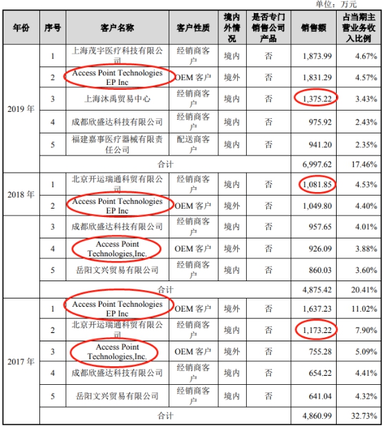 2017年-2019年,惠泰医疗对Access Point Technologies,Inc.的销售金额分别为755.28万元、926.09万元、661.08万元,2017年、2018年系惠泰医疗第3、4大客户,2019年退出前五客户。