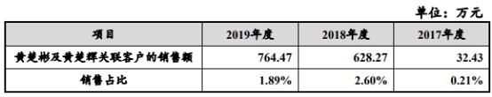 2017年-2019年,惠泰医疗向黄楚彬及黄楚辉上述关联客户的销售额分别为32.43万元、628.27万元、764.47万元,销售占比分别为0.21%、2.60%、1.89%。