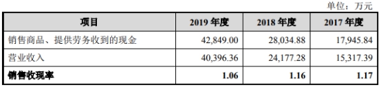2017年-2019年,惠泰医疗营业收入分别为1.53亿元、2.42亿元、4.04亿元,销售商品、提供劳务收到的现金分别为1.79亿元、2.80亿元、4.28亿元,销售收现率分别为1.17、1.16、1.06。