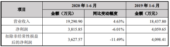 2020年1-6月,公司营业收入为1.93亿元,同比略升约4.63%;净利润为3815.85万元,同比下降约6.01%;扣除非经常性损益后归属于母公司净利润为3627.57万元,同比下降约11.49%。