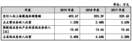 2017年-2019年,发行人向上海载逸的销售额分别为539.65万元、593.39万元、493.67万元,占主营业务收入比重分别为3.63%、2.48%、1.23%;因配送业务而产生的其他业务收入分别为10.66万元、13.66万元、10.60万元,占其他业务收入比重分别为2.28%、4.64%、3.45%。