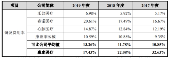 2017年-2019年,惠泰医疗研发费用分别为4998.46万元、5337.79万元、7042.27万元,研发费用率分别为32.63%、22.08%、17.43%。同行研发费用率均值分别为10.85%、11.78%、13.26%。