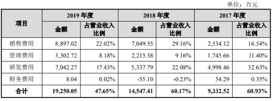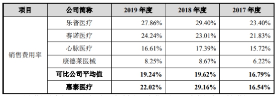 同期,销售费用分别为2534.12万元、7049.35万元、8897.02万元,销售费用率分别为16.54%、29.16%、22.02%。同行可比公司销售费用率平均值分别为16.79%、19.62%、19.24%。