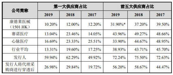 报告期内,公司第一大供应商即Wah Shun Trading Co.原材料采购金额占比分别为49.92%、62.29%和59.94%,供应商集中度高于同行业可比上市公司,各期同行第一大供应商占比平均值分别为17.25%、19.60%、13.31%。惠泰医疗第一大供应商占比始终为同行最高,且远超同行。