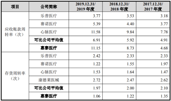 惠泰医疗招股书称,报告期内,公司应收账款周转率处于较高水平,与心脉医疗比较接近,主要原因系公司结算方式多采取“先款后货”的模式,对客户信用期及回款的管理严格。公司应收账款周转率整体高于可比公司平均水平,主要因为:(1)乐普医疗因业务涵盖药品、器械等多个领域,药品全国大多数地区已实施“两票制”政策,因此应收账款金额相对较大,周转率相对较低。(2)赛诺医疗因直销收入占比相对较高,因此应收账款货款周期较长,金额较大,从而导致应收账款周转率相对较低。报告期内,发行人存货周转率与赛诺医疗、心脉医疗更为接近,主要是由于产品的种类相似度更高。但是,由于所生产的心血管产品具体用途有所差异,因此,各家公司的产品管线、原材料备货也存在一定的差异。