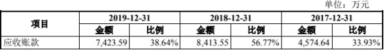 2017年至2019年,鼎通精密应收账款账面价值分别为4574.64万元、8413.55万元、7423.59万元;占流动资产比例分别为33.93%、56.77%、38.64%。