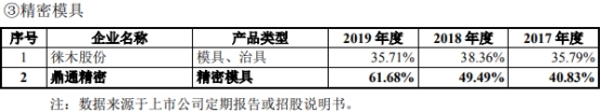 2017年至2019年,鼎通精密精密模具产品毛利率分别为40.83%、49.49%、61.68%,同行业可比上市公司徕木股份模具、治具产品毛利率分别为35.79%、38.36%、35.71%;