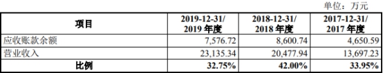 2017年至2019年,鼎通精密应收账款余额分别为4650.59万元、8600.74万元、7576.72万元;占营业收入比例分别为33.95%、42.00%、32.75%。