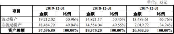 2017年至2019年,鼎通精密资产总额分别为2.05亿元、2.94亿元、3.77亿元;其中,流动资产分别为1.35亿元、1.48亿元、1.92亿元;非流动资产分别为7019.72万元、1.46亿元、1.85亿元。