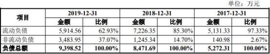 2017年至2019年,鼎通精密负债总额分别为5272.31万元、8471.69万元、9398.52万元;其中,流动负债分别为5131.33万元、7226.35万元、5914.56万元;非流动负债分别为140.98万元、1245.34万元、3483.95万元。