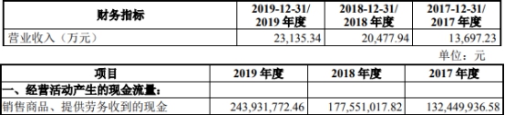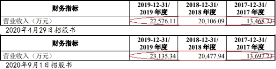 2020年9月1日招股书:2017年至2019年营业收入分别为13697.23万元、20477.94万元、23135.34万元。