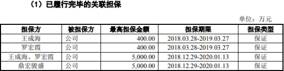 已履行完毕的关联担保:王成海2018年3月28日至2019年3月27日担保400.00万元;罗宏霞2018年3月28日至2019年3月27日担保400.00万元;王成海、罗宏霞2018年12月29日至2020年1月13日担保5000.00万元;鼎宏骏盛2018年12月29日至2020年1月13日担保5000.00万元。