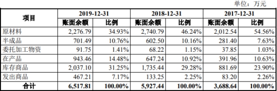 2017年至2019年,鼎通精密存货余额分别为3688.64万元、5927.44万元、6517.81万元;存货账面价值分别为3556.66万元、5663.78万元、6210.10万元;占资产总额比例分别为17.35%、19.28%、16.47%。