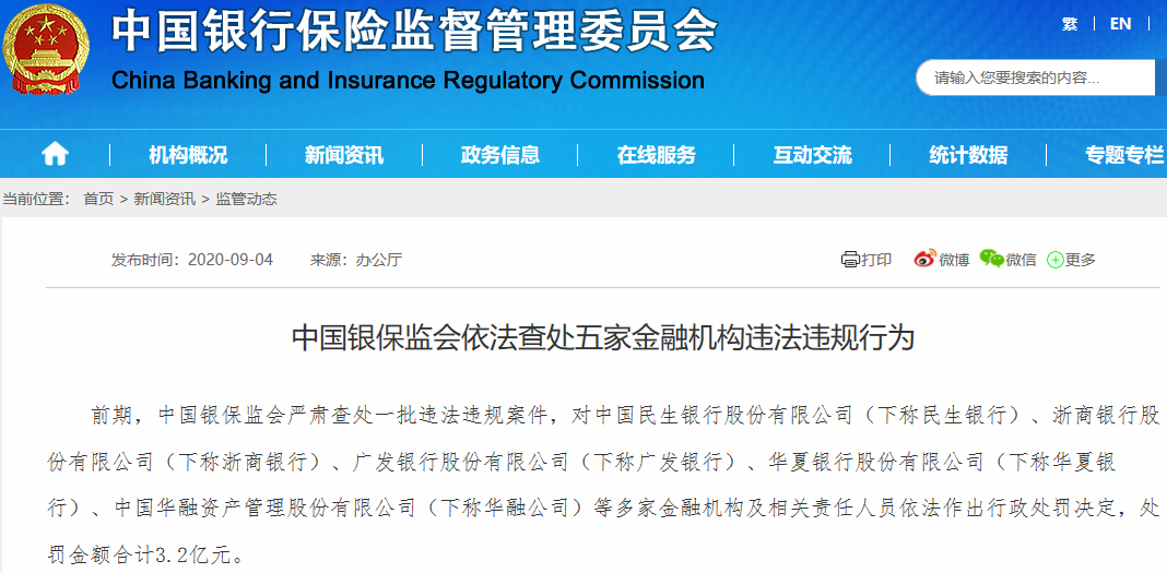 9月4日,银保监会官网公布消息称,前期,银保监会严肃查处一批违法违规案件,对民生银行、浙商银行、广发银行、华夏银行、中国华融资产管理股份有限公司等多家金融机构及相关责任人员依法作出行政处罚决定,处罚金额合计3.2亿元。