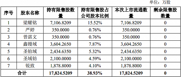 此次解禁的原始股东涉及7位,分别为自然人股东梁耀铭、严婷、曾湛文,法人股东广州市鑫镘域投资管理合伙企业(有限合伙)、广州市圣铂域投资管理合伙企业(有限合伙)、广州市圣域钫投资管理企业(有限合伙)、广州市锐致投资管理合伙企业(有限合伙)。其中梁耀铭为金域医学实控人、董事长、总经理,其持有限售股比例为15.52%。