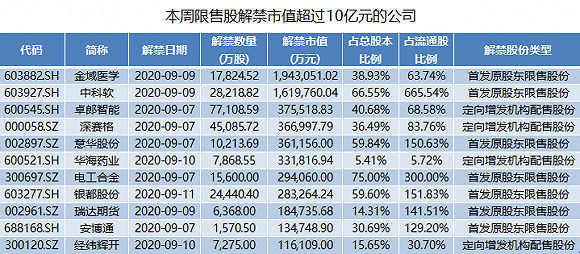 同时,解禁市值超过10亿元的上市公司有11家。金域医学、中科软两家解禁市值超过100亿元。卓郎智能、深赛格、意华股份(002897.SZ)、华海药业(600521.SH)四家公司解禁市值超过30亿元。